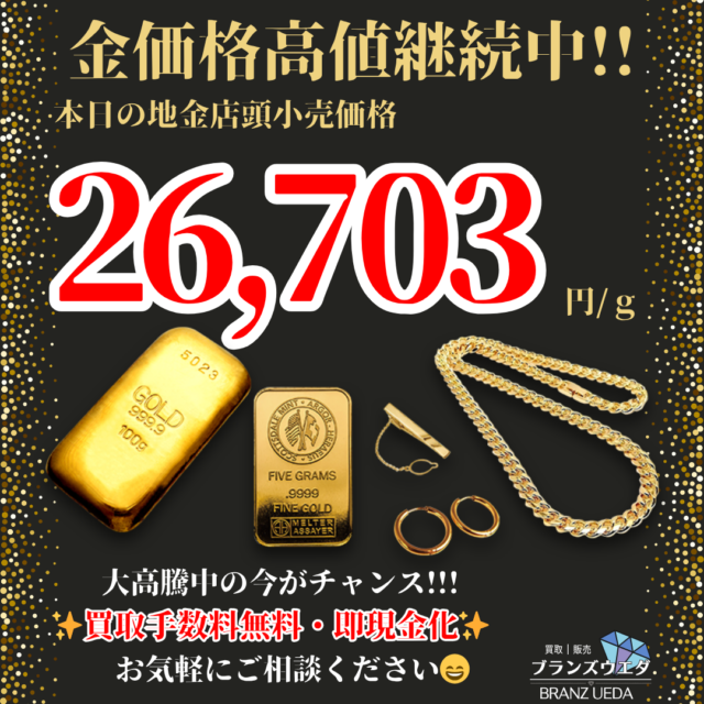 こんにちは♪ブランズウエダです😊 @branz.ueda_ 本日の金価格です✨ 先週より少しアップ!! 高値継続中 どこよりも高く売るなら当店へ! 無料査定で安心納得 お家に...